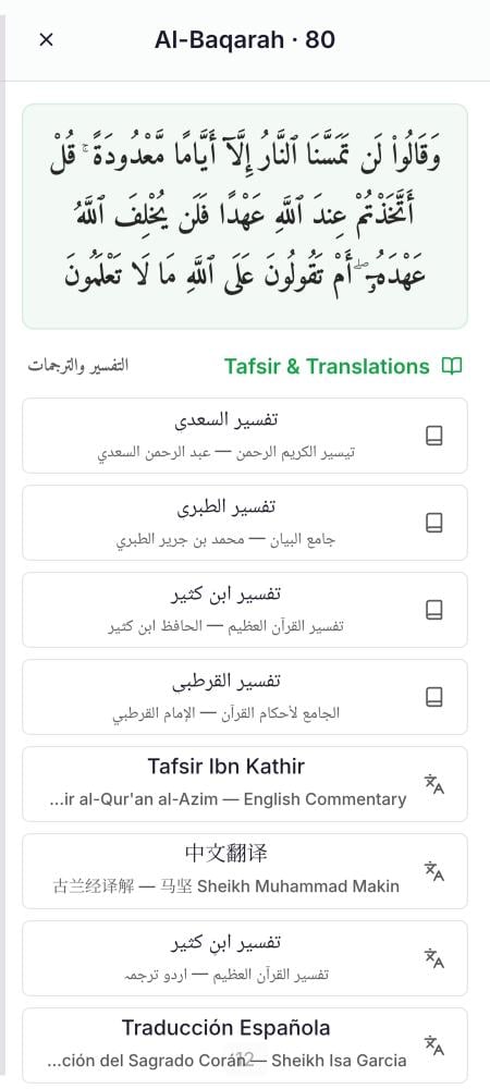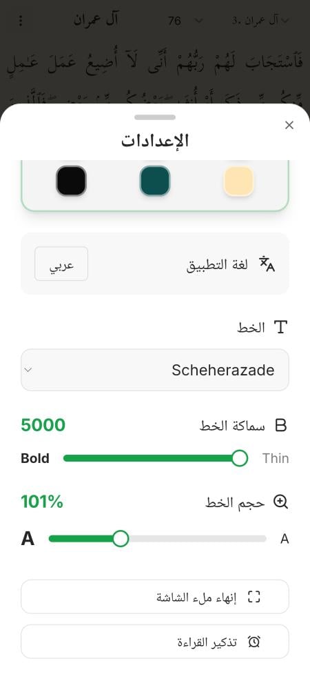 التحكم بحجم الخط: ميزة تكبير وتصغير الخط بكل سلاسة لتناسب كبار السن وأصحاب النظر الضعيف. ملء الشاشة: خيار القراءة بوضع ملء الشاشة لتجربة تلاوة خالية من المشتتات.