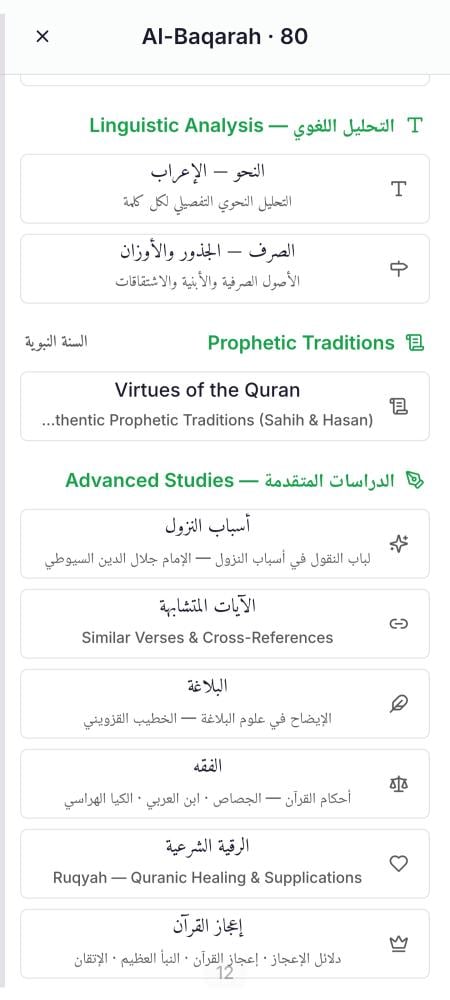 ثيمات متعددة: إمكانية تغيير شكل المصحف ليناسب ذوقك، مثل "ثيم التجويد" الملون لتسهيل القراءة بأحكام التلاوة الصحيحة . مكتبة علمية لعلوم القرآن: التفاسير: يحتوي التطبيق على مجموعة واسعة من التفاسير المتنوعة لفهم معاني الآيات. الإعجاز القرآني: قسم مخصص لتأمل روائع الإعجاز في كتاب الله . علوم اللغة: أقسام متخصصة تشمل إعراب القرآن (النحو)، والصرف، والبلاغة. كذلك يوجد مؤقت القراءة: أداة ذكية لحساب زمن القراءة وتتبع إنجازك اليومي . مواقيت الصلاة دقيقة جدا الرقية الشرعية: قسم خاص يضم الرقية الشرعية بالإضافة إلى العديد من المزايا والخصائص الأخرى التي بانتظارك لاكتشافها.